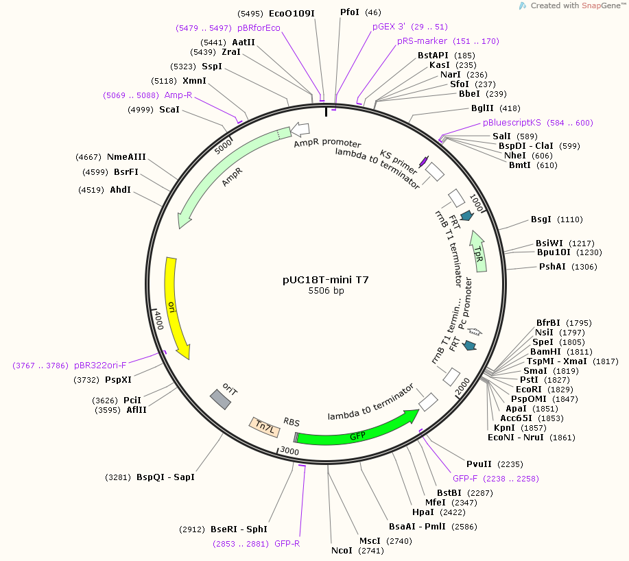 | 65033 pUC18T-mini-Tn7T-Tp-gfpmut3 广宿主细菌转座子荧光标记质粒 |