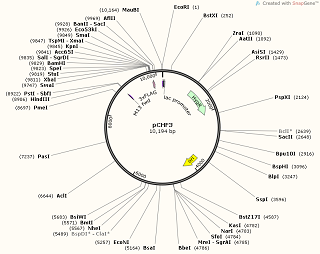 pCHF3-EGFP植物荧光表达载体,35S启动子+MCS基因插入位点,35S启动子+EGFP绿色荧光报告基因。Kan抗性,Hyg植物筛选标记