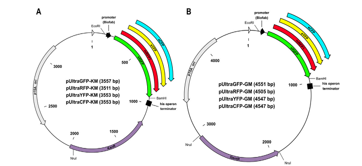 | 肠杆菌通用型多荧光载体pUltra,eCFP,sfGFP,mRFP1,eYFP,适合标记肠杆菌,希瓦菌,嗜血杆菌 |