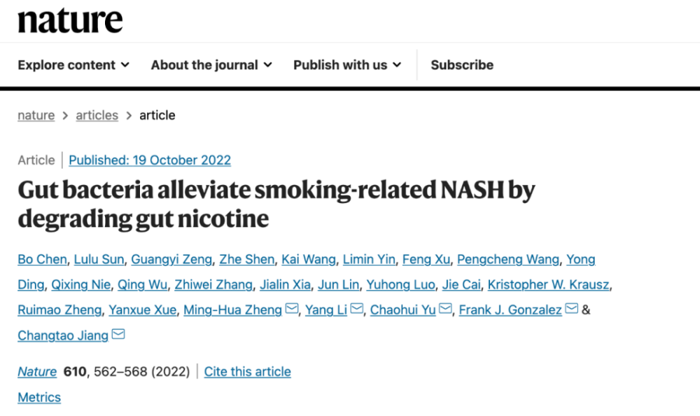 2022年10月19日,北京大学基础医学院姜长涛团队联合美国国立卫生研究院的Frank J. Gonzalez、浙江大学医学院第一附属医院虞朝辉、复旦大学基础医学院李洋、温州医科大学第一附属医院郑明华等人,在国际顶尖学术期刊 Nature 上发表了题为:Gut bacteria alleviate smoking-related NASH by degrading gut nicotine 的研究论文。