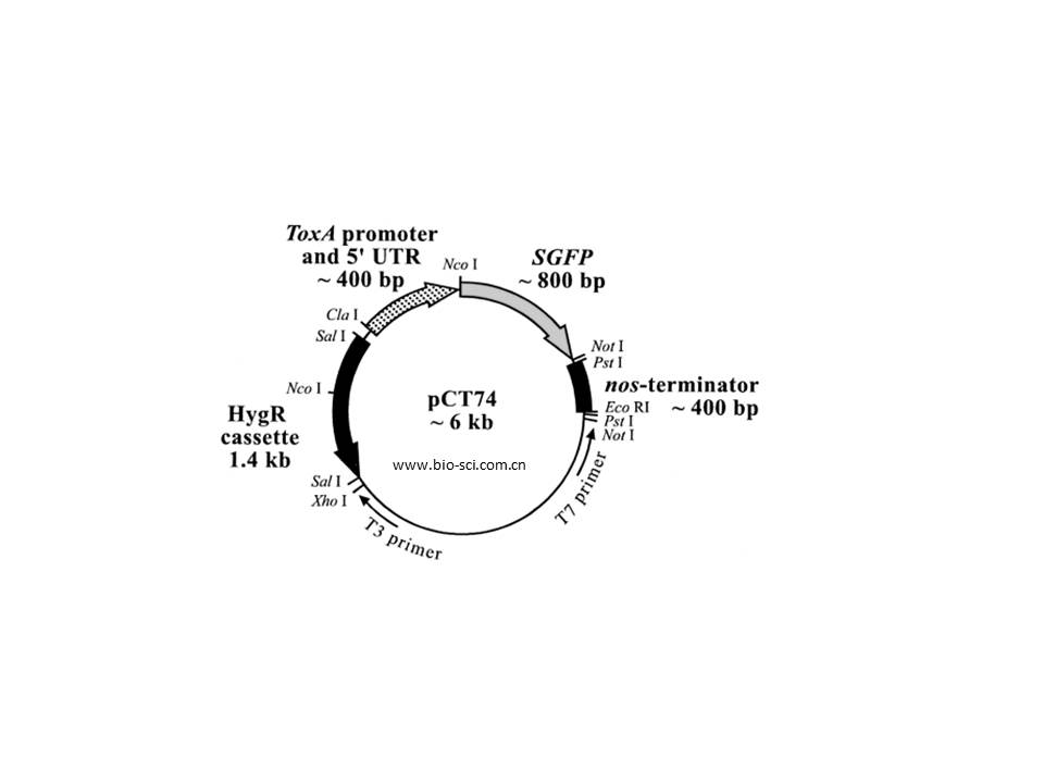 pCT74 是一种广宿主丝状真菌荧光载体,可以广泛用于各种丝状真菌的荧光标记,例如曲霉,葡萄孢,灰霉,座腔菌。