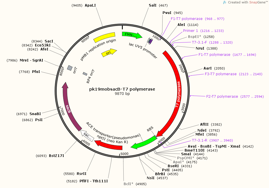 pk19mobSacB 骨架基础上,插入了 T7RNA polymerase,可以在普通细菌中大量表达T7 RNA聚合酶,配合t7启动子使用。