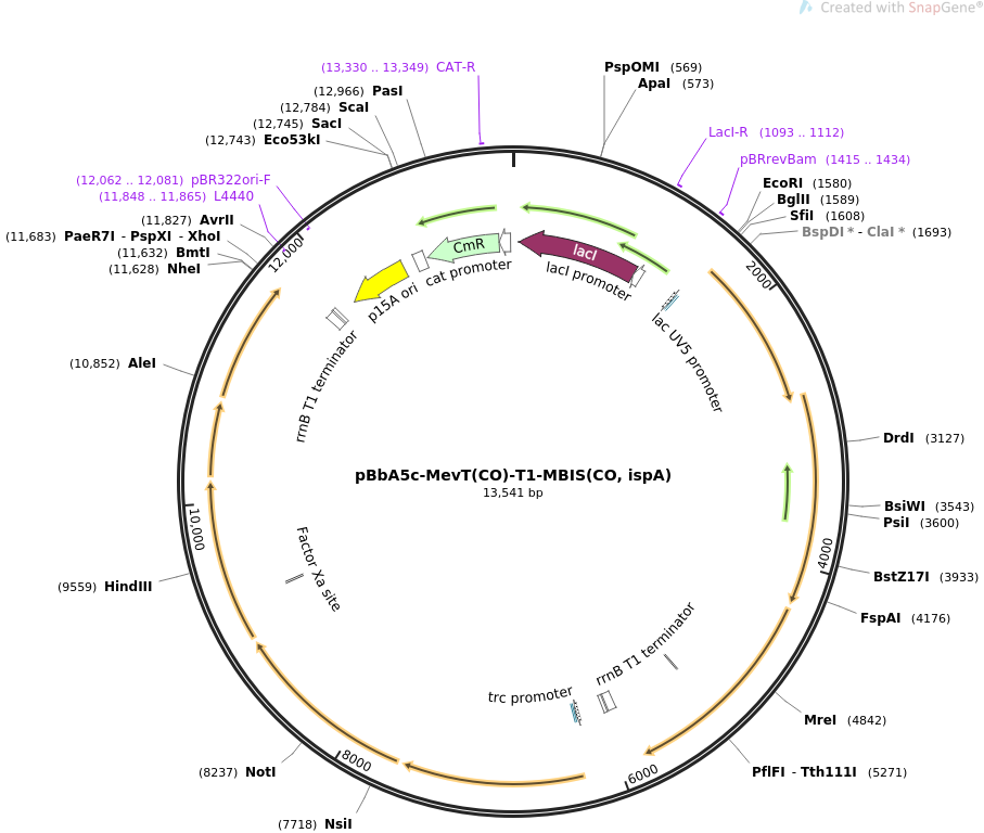 | 合成生物学质粒 pBbA5c-MevT(CO)-T1-MBIS(CO, ispA) |