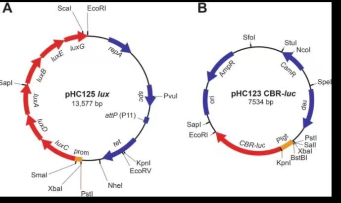金黄色葡萄球菌启动子报告基因载体pHC125lux,pHC123 CBRluc