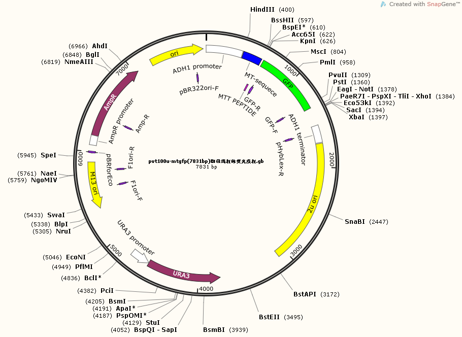 酿酒酵母线粒体定位绿色荧光蛋白标记质粒pvt100u-mtGFP