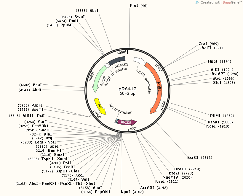 酿酒酵母表达载体pRS412,ade筛选标记,CEN/ARS筛选标记