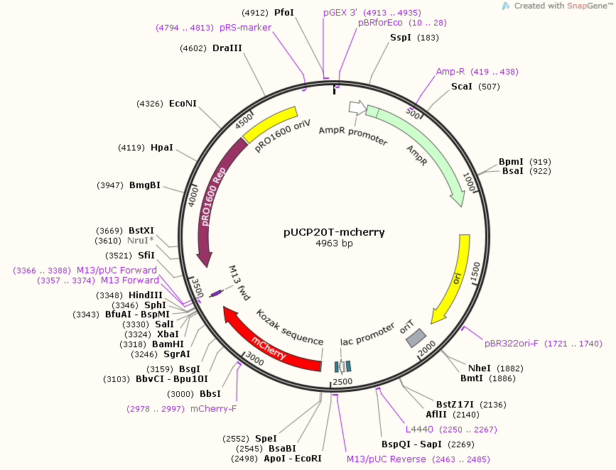 | 广宿主荧光标记质粒pUCP20T-mcherry( 发射波长640nm,适合小动物活体成像) |