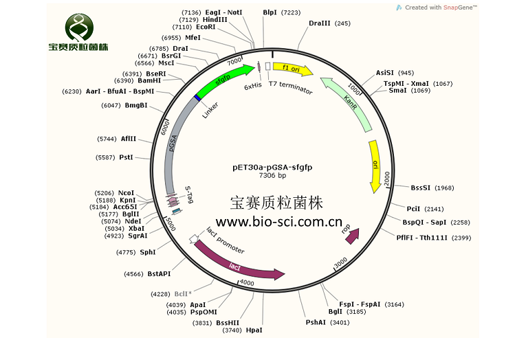 | 大肠杆菌表面展示载体,T7启动子,兼容BL21(DE3)宿主菌,GSA铆定蛋白,融合带有sfgfp荧光蛋白 |