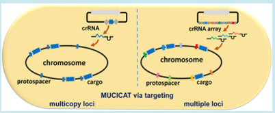 high-efficiency biocatalysts. Current strategies mostly use plasmid vectors, but multicopy plasmids are often genetically unstable, and their copy numbers cannot be precisely controlled. The integration of expression cassettes into a bacterial chromosome has advantages, but iterative integration is laborious, and it is challenging to obtain a library with varied gene doses for phenotype characterization. Here, we demonstrated that multicopy chromosomal integration using CRISPR-associated transposases (MUCICAT) can be achieved by designing a crRNA to target multicopy loci or a crRNA array to target multiple loci in the Escherichia coli genome. Within 5 days without selection pressure, E. coli strains carrying cargos with successively increasing copy numbers (up to 10) were obtained. Recombinant MUCICAT E. coli containing genomic multicopy glucose dehydrogenase expression cassettes showed 2.6-fold increased expression of this important industrial enzyme compared to E. coli harboring the conventional protein-expressing plasmid pET24a. Successful extension of MUCICAT to Tatumella citrea further demonstrated that MUCICAT may be generally applied to many bacterial species.