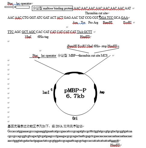 pET-MBP表达载体采用E.coli tac启动子和分泌型麦芽糖结合蛋白(maltose binding protein)同时选用凝血酶切割位点并在C端添加6个His便于采用chelating sepharose亲和层析纯化目标蛋白。该表达系统在Medline里有大量的背景文献参考。它通过MBP引导分泌,可以实现许多基因在周质空间里正确折叠,如TPO(1-153aa)、GM—CSF、IL—2等。采用这一表达系统配合固相化的凝血酶成功地获得了正确折叠的rhGM—CSF,临床试用表明其副反应比包涵体型rhGM—CSF大大降低。该表达载体表达的蛋白还可通过Amylose亲和层析。