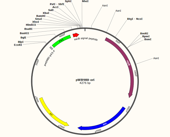 pwb980 是一种用途广泛的枯草芽孢杆菌高效分泌表达载体 ,带有强启动子p43和高效信号肽SacB,能够分泌表达大量的外源蛋白,成功案例最多。