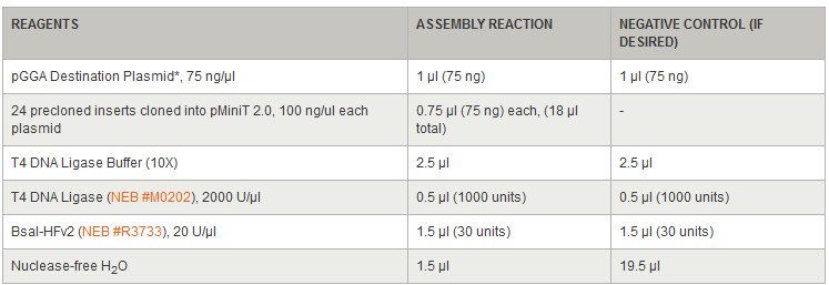 * Included in the NEB Golden Gate Assembly Mix (NEB #E1600) Note: For complex (>10 fragment) assemblies, high efficiencies are achievable with increased ligase and BsaI-HFv2 levels (1000 units T4 DNA Ligase, 30 units BsaI-HFv2), as listed in this protocol. For assemblies involving 10 fragments and less, the standard amounts (500 units T4 DNA Ligase, 15 units BsaI-HFv2) are sufficient. Note the reaction volume of 25 µl is used to allow sufficient volume for precloned insert additions, if needed.