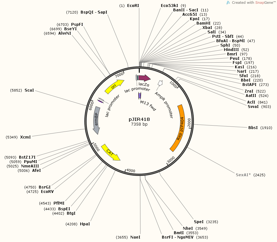 pJIR418: carrying catP, confers thiamphenicol resistance .