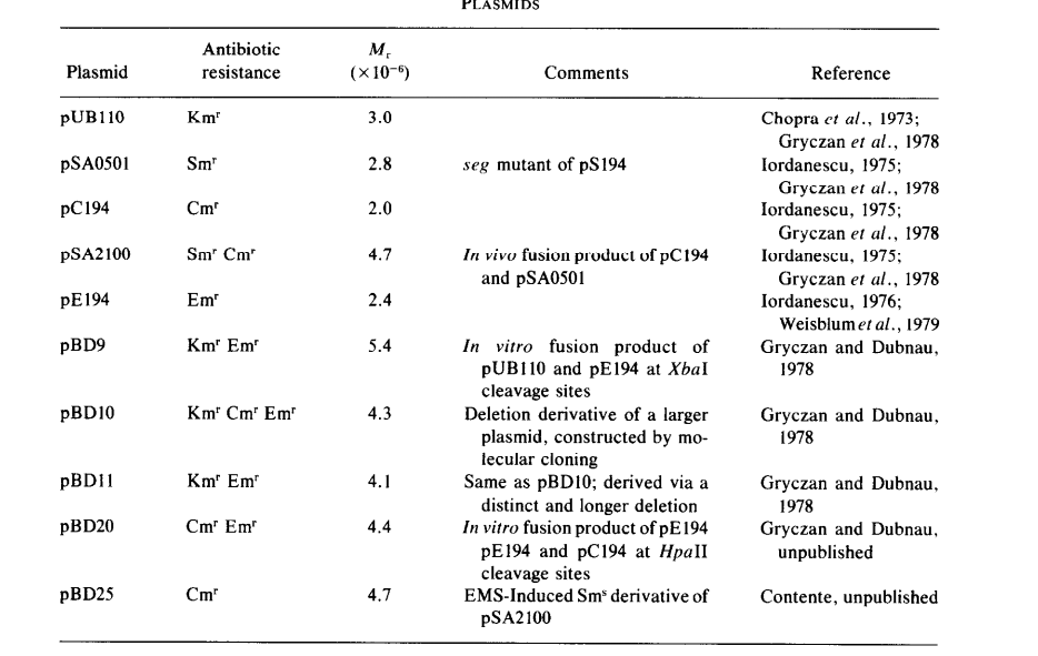 | 枯草芽孢杆菌质粒pC194,pSA0501,pUB110,pSA2100,pBD,pBD25 |
