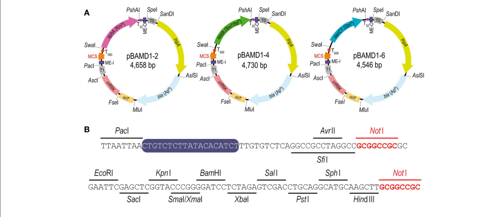 | pBAMD1-2, pBAMD1-4, pBAMD1-6, 革兰氏阴性菌广宿主转座子质粒mini tn5 |