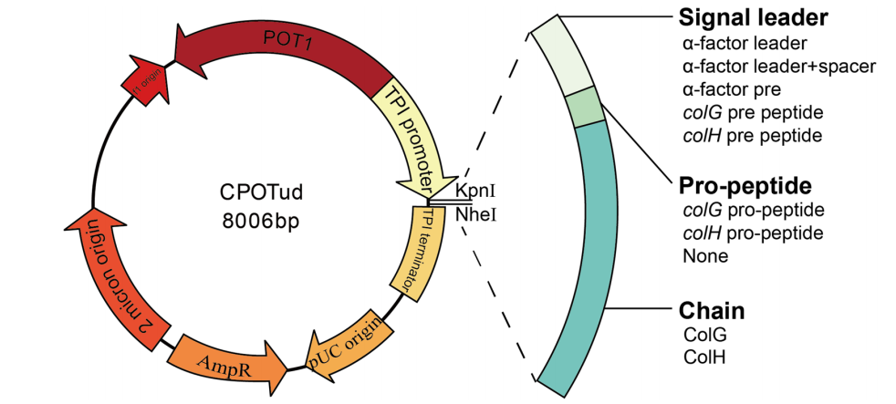将从组织溶梭状芽胞菌种获得的I型II型胶原酶基因colG和colH密码子优化后通过质粒转入蛋白分泌优化酿酒酵母底盘菌B184M中。使用添加终浓度10 mM氯化钙和0.6 mM氯化锌的YPD培养基发酵后对底物FALGPA(N-[3-(2-furyl) acryloyl]-Leu-Gly-Pro-Ala)表现出了较高酶活。为进一步提升酶活,作者对信号肽及启动子进行了优化,最终选择了TPI1p启动子并采用α因子信号肽-colG前导肽-colG这一结构进行表达获得了最高产量。随后作者通过对比重组菌株BG02(表达colG)和BH01(表达colH)的生长曲线发现两个蛋白主要分泌阶段处于生长过程中的不同时期,colG在较早时期就达到很高水平,而colH则分泌滞后,并推断增加NADPH水平可增产蛋白。