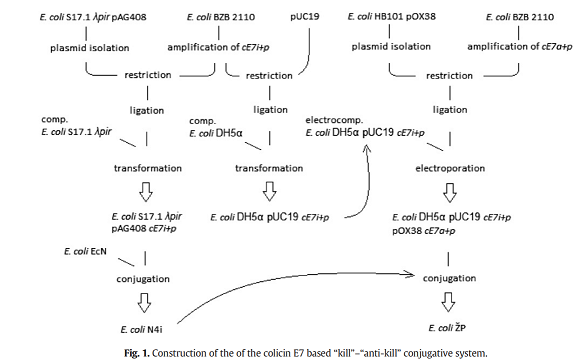 利用基因编辑技术,在益生菌Nissle1917菌株中,导入一个广宿主结合转移质粒pOX38,表达 “kill” gene (colicin ColE7 activity gene) ;同时在基因组上整合表达“anti-kill” gene (ColE7 immunity gene),构建一个工程菌,名字叫做Strain ŽP。这个菌株可以通过过结合转移,将pOX38质粒转入其他肠杆菌菌株中,通过pOX38质粒上面的Kill基因,杀死其他肠杆菌。